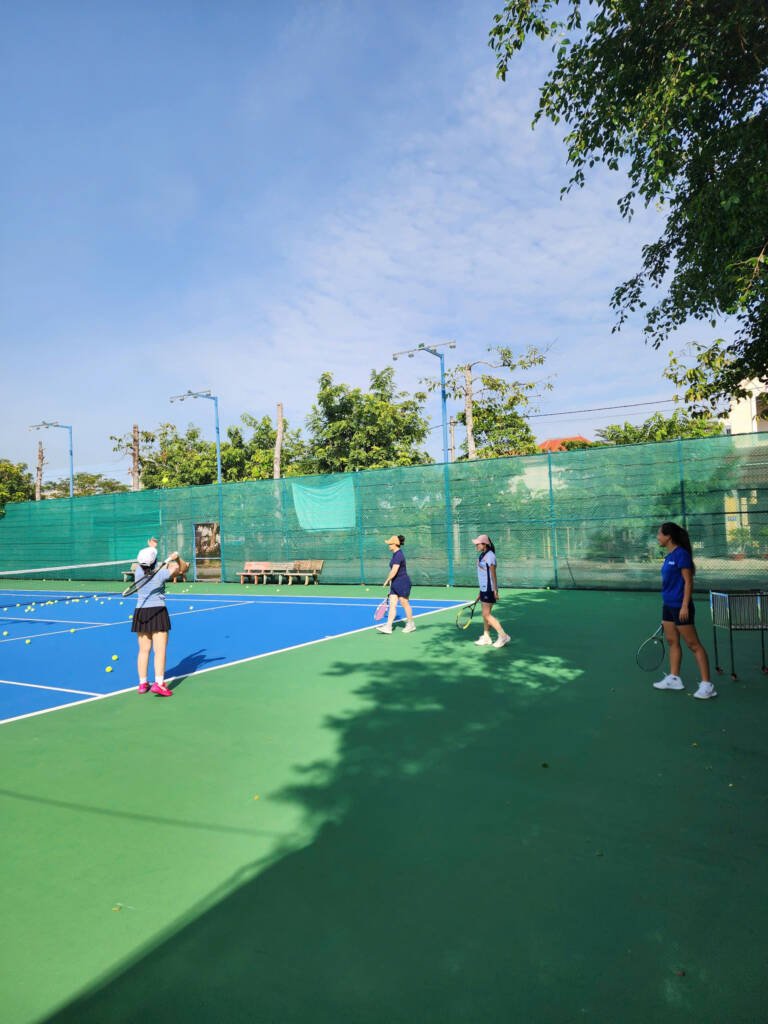 Các học viên nữ đang tập luyện giao bóng cùng với HLV nữ ( trái) và buổi giao lưu giữa Trung tâm với CLB lân cận ( phải).